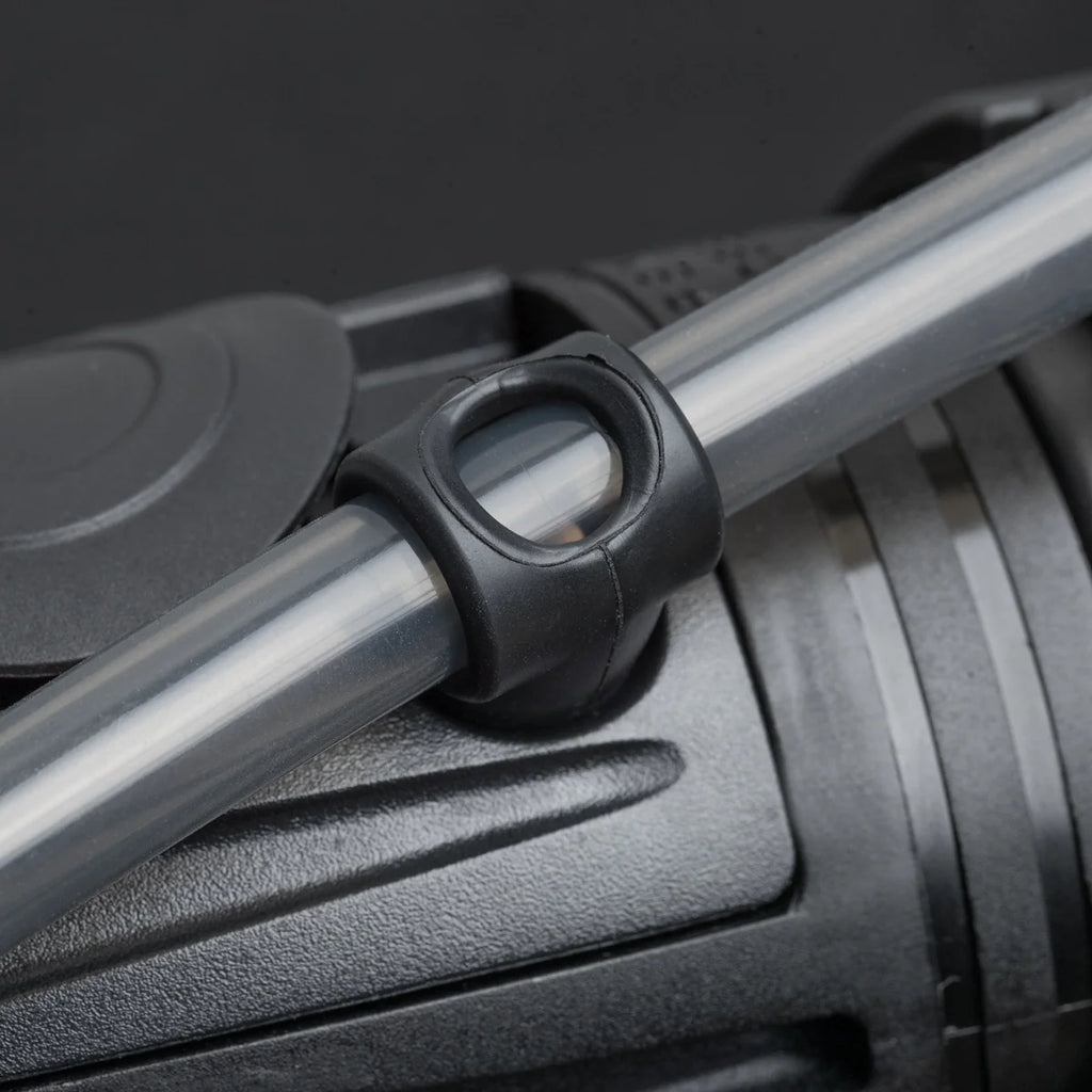 Die Halterung hat eine leicht abgesenkte 'V'-Form, um sie zwischen den Extensions zu zentrieren und das Risiko zu reduzieren, dass die Flasche mit schmalen Armlehnenpositionen kollidiert. Die Halterung ermöglicht eine 40mm-Spannweite in der Abstandseinstellung der Extensions.