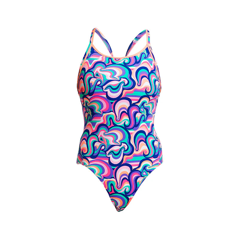 Der Diamond Back ist der klassische Trainingsbadeanzug von Funkita für Damen. Das Model hat verstärkte Träger, einen verkleinerten Rückenausschnitt und das Bein ist normal hoch geschnitten, für deine perfekte Trainingseinheit im Wasser. Damit auch nichts rausblitz hat der Badeanzug ein zusätzliches Futter im Frontbereich.