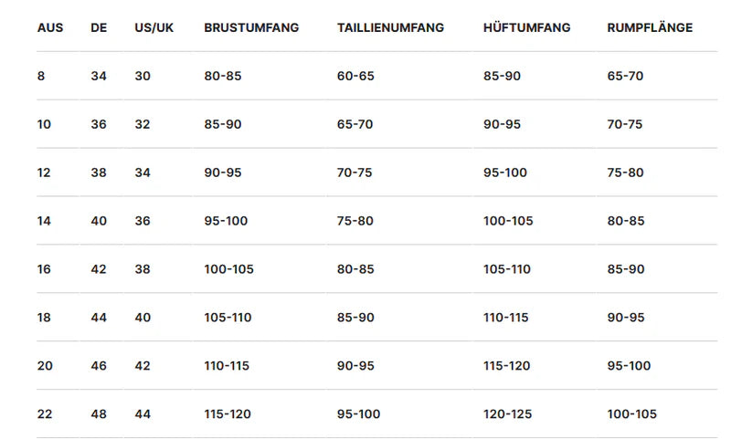 AUS DE US/UK BRUSTUMFANG TAILLIENUMFANG HÜFTUMFANG RUMPFLÄNGE