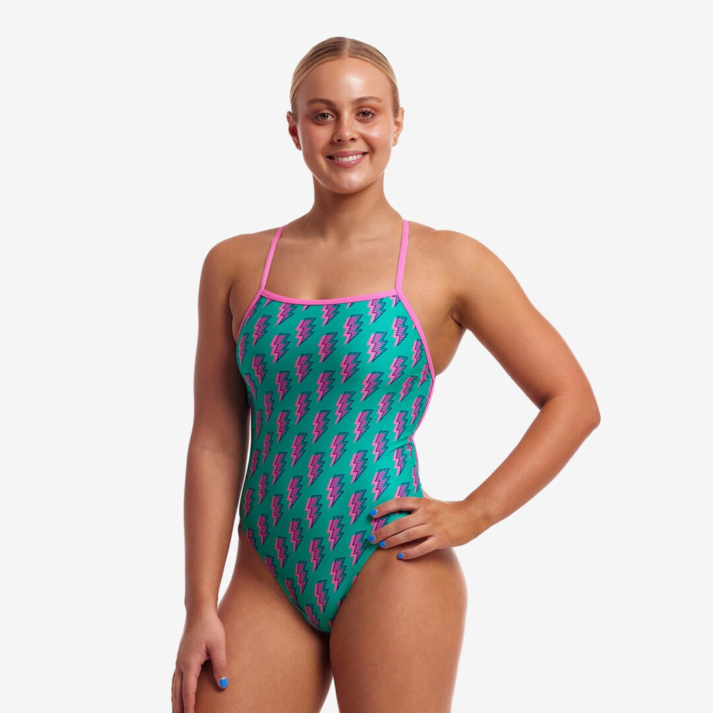 Mit dem Funkita Damen Trainingsbadeanzug Strapped In kannst du deinen Rücken gekonnt in Scene setzten. Die schmalen Träger laufen im Zick Zack über deinen Rücken und der Beinausschnitt ist extra hoch, damit du die größtmögliche Bewegungsfreiheit hast. Damit vorne nicht rausblitzen kann hat der Badeanzug ein Innenfutter im Frontbereich.