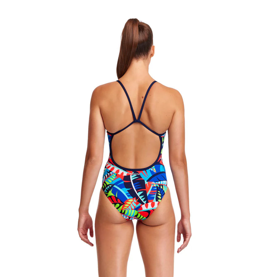 Der Damen Single Strap Badeanzug von Funkita hat einen sportlichen Rückenausschnitt, mit einem dünnen V-Träger, welcher dir bei deinem Training die nötige Bewegungsfreiheit bietet. Damit bei dem Badeanzug nichts durchschimmert, hat dieser ein Innenfutter im Frontbereich. Die Beinausschnitte haben eine normale Höhe.