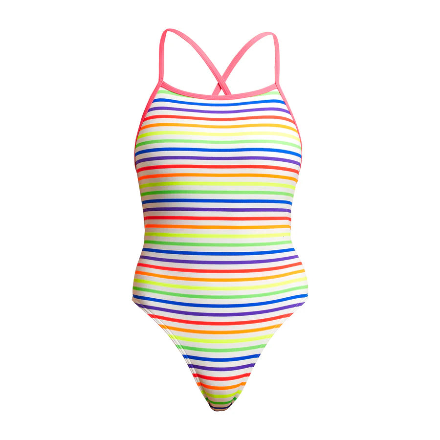Der Tie Me Tight Badeanzug von Funkita lässt sich im Rücken schnüren, wie ein Bikini damit du die beste Passform und den höchsten Komfort für dich persönlich finden kannst. Dank des chlorbeständigen C-Infinity Gewebes halten die Farben besonders lange.