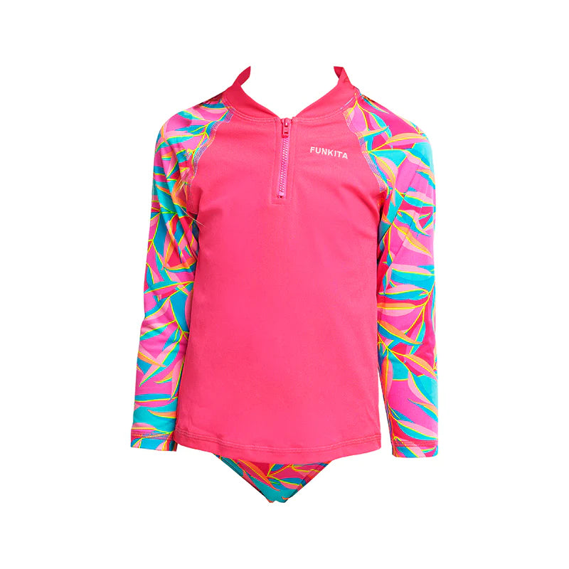 Schütze deine Kleine vor der Sonne mit dem Funkita Zippy Rash Vest UV 50+Sonnenschutzoberteil. Das Shirt ist weit geschnitten und hat einen ½ Zip Reißverschluss, wodurch es sich leicht an- und ausziehen lässt, auch wenn Sonnencrem, Sand und Wasser mit ins Spiel kommen.